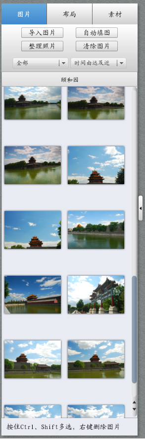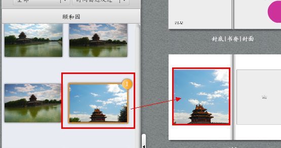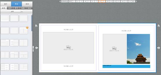 图片导入后再左侧“图片”中选择(如果导入的图片不够,可以继续导入图片,如果有多余图片可以按住Ctrl或Shift键多选,右键删除图片),按自己的想法选择图片,一张张的拖到右侧对应的画册模版中。