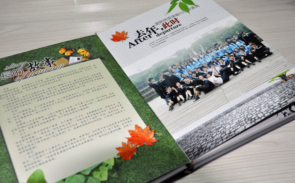 其次是,高质量的照片和有感而发的文字资料。这就像厨师做菜一样,有了好的原材料,才能做出喷香惹眼的饭菜。同样,客户提供的照片清晰度,照片的创意性,资料的完整性都会影响一本纪念册的质量。做一次毕业纪念册或者聚会纪念册是相当不容易的,所以,建议大家多抽一点时间,找一个专业的摄影师去拍照片,之后再抽一点点去完善自己的资料。